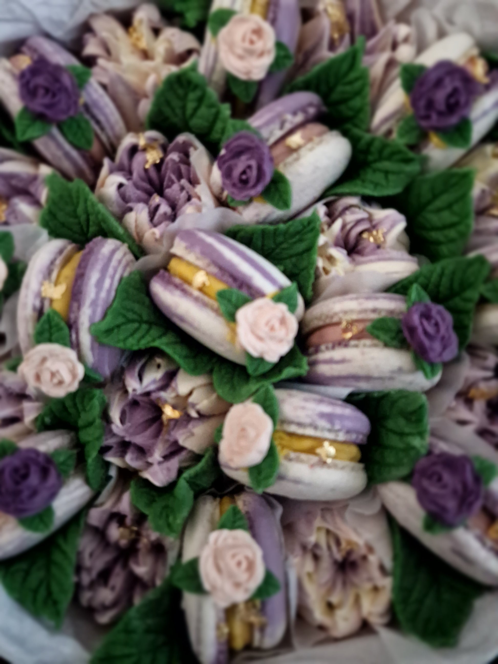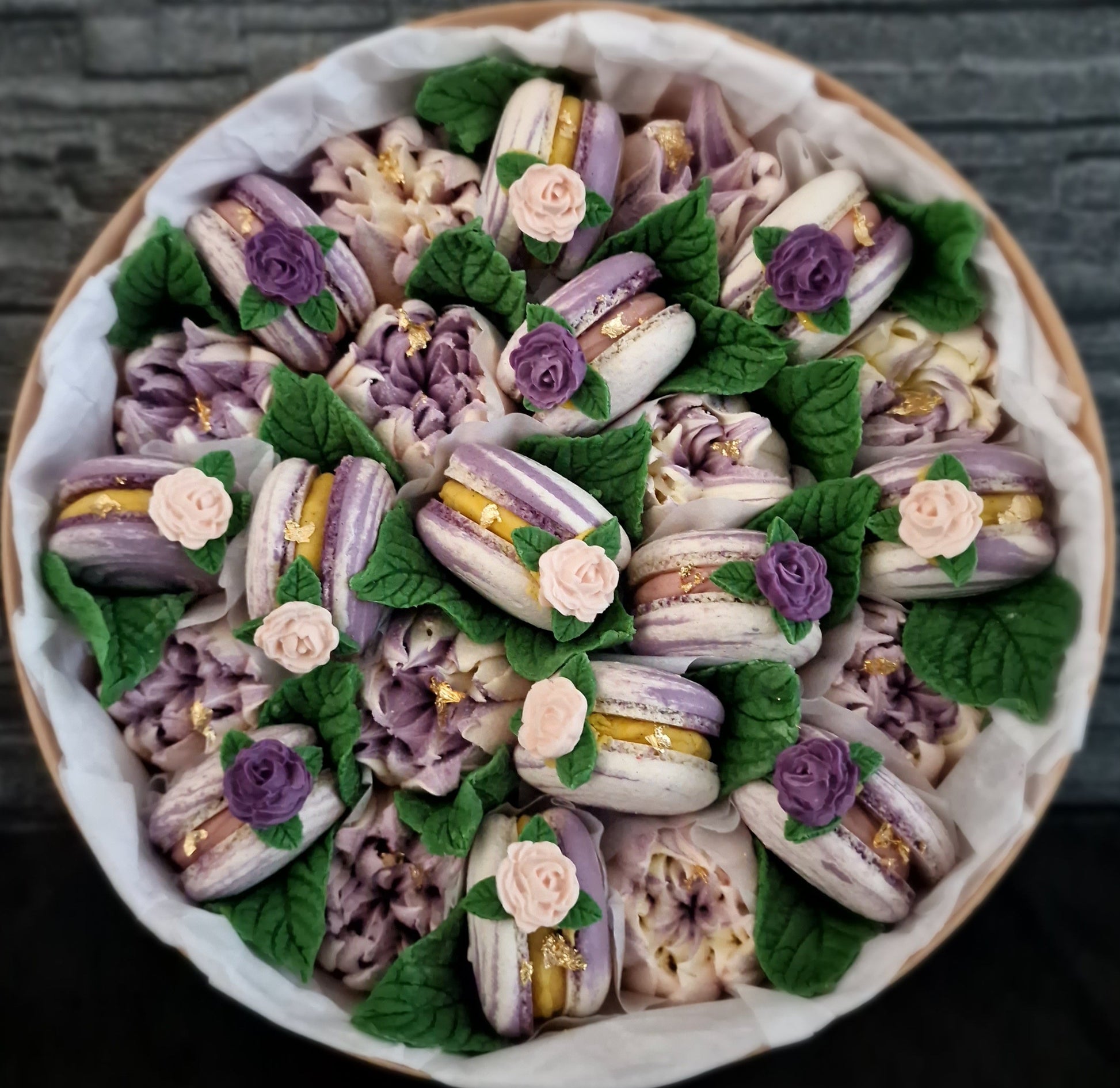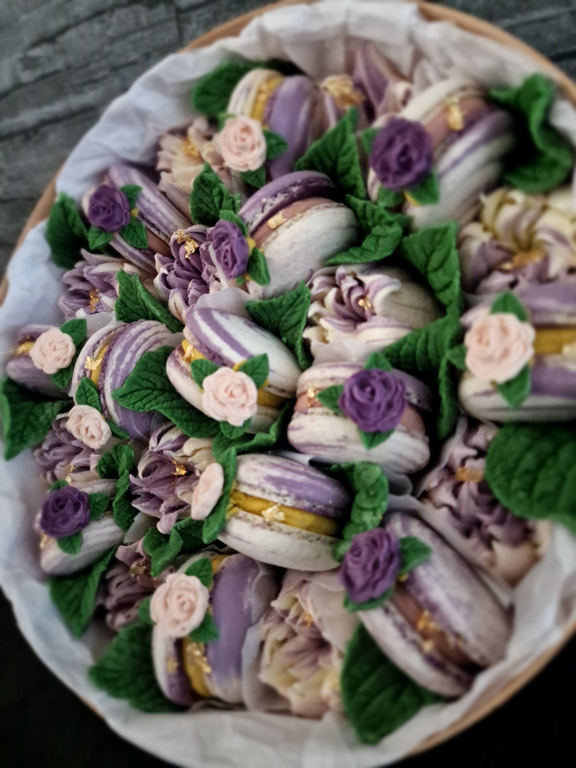 Elke box is met zorg samengesteld en bestaat uit elegante macarons gevuld met een romige ganache lavendel en vanillevulling, afwerkt met eetbaar bladgoud en omringd door kunstzinnig gespoten bloemen van merengue en fruitpuree.