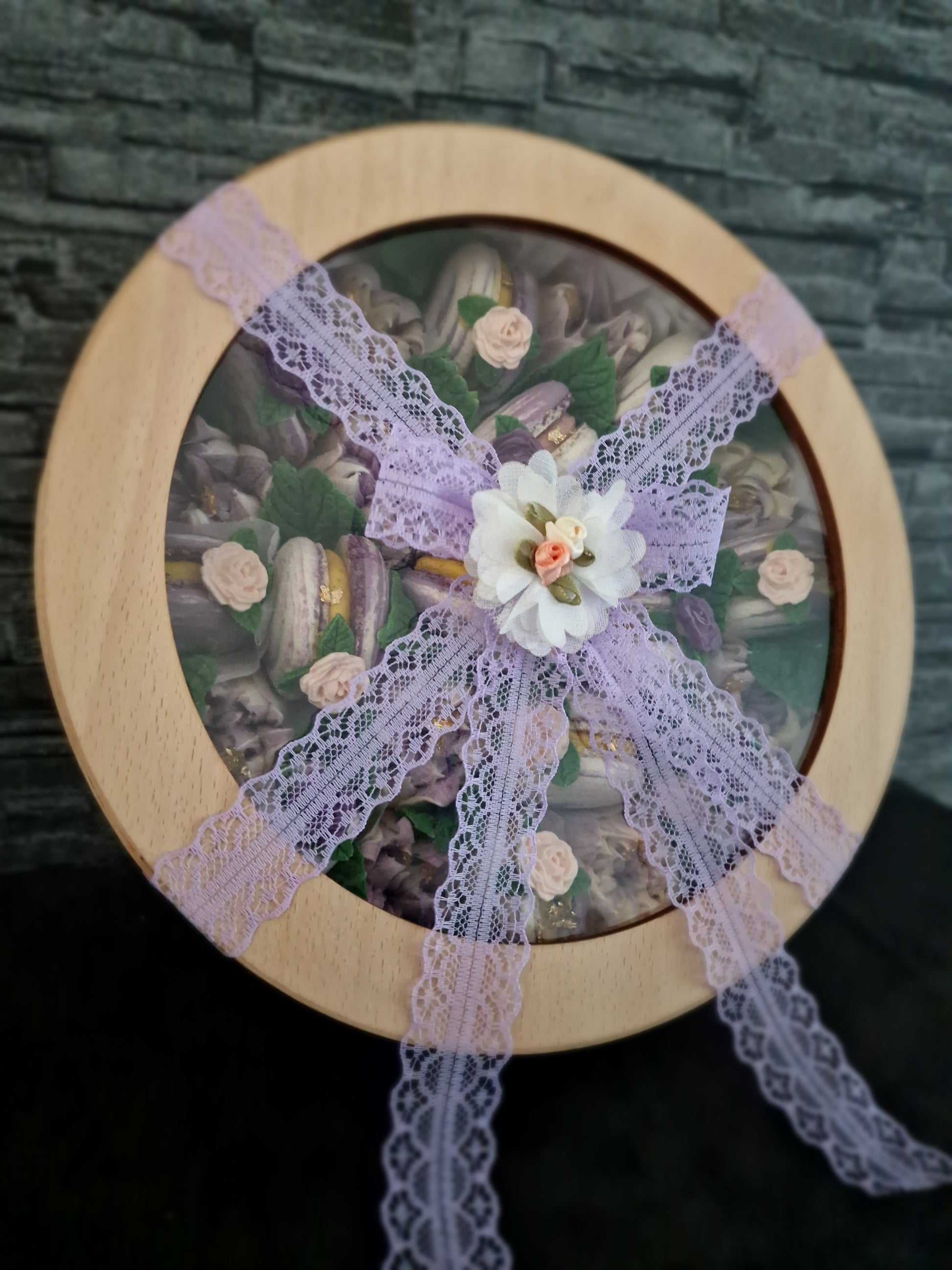 Een luxe, handgemaakte bloemenbox vol ambachtelijke macarons en merengue bloemen in zachte lila- en crèmetinten.