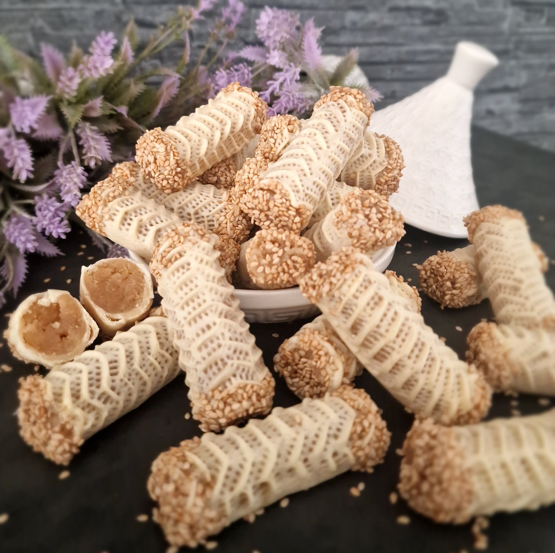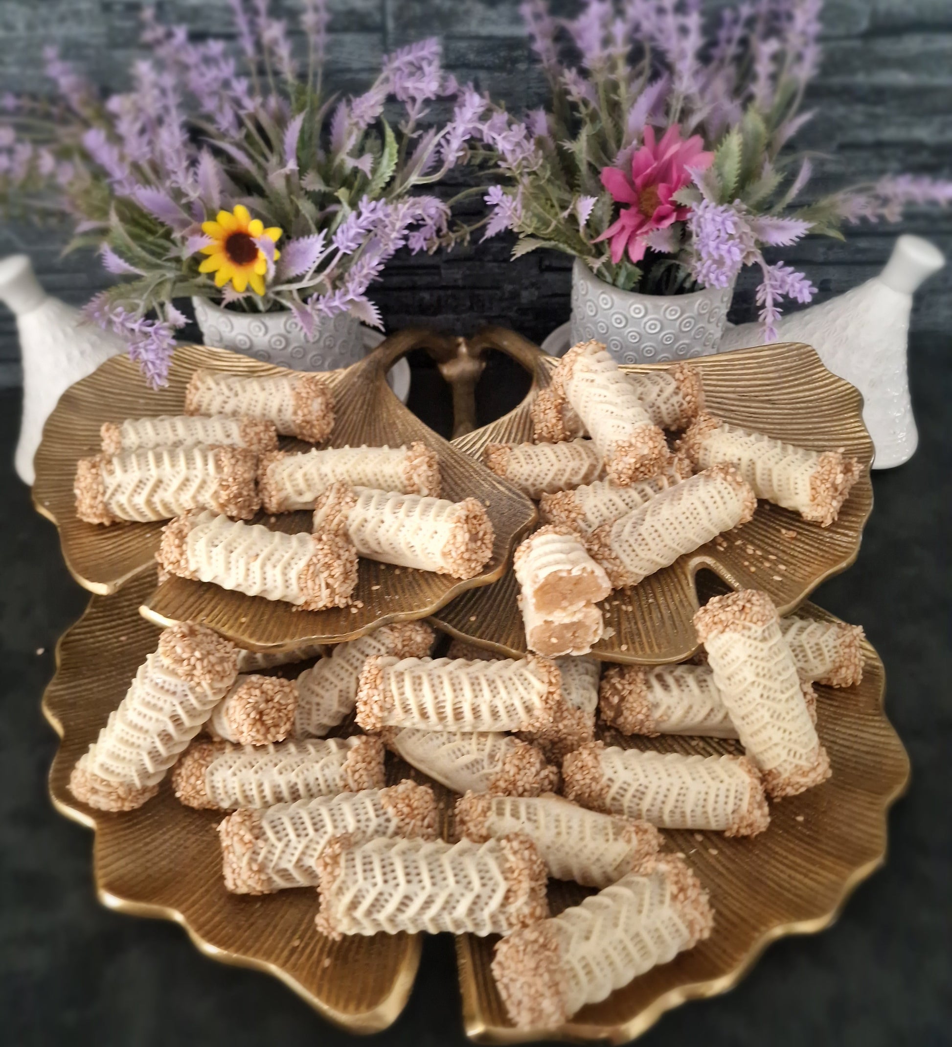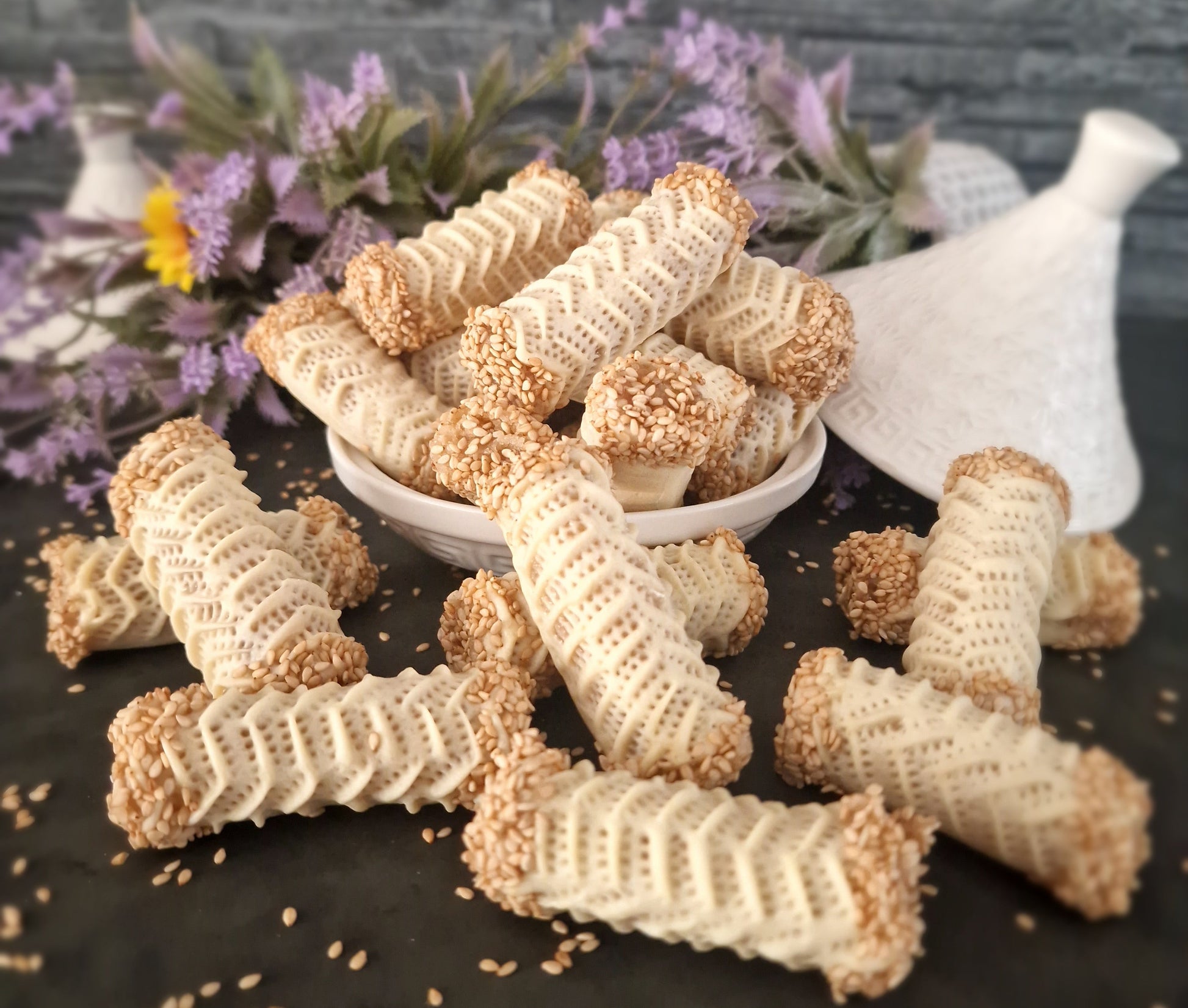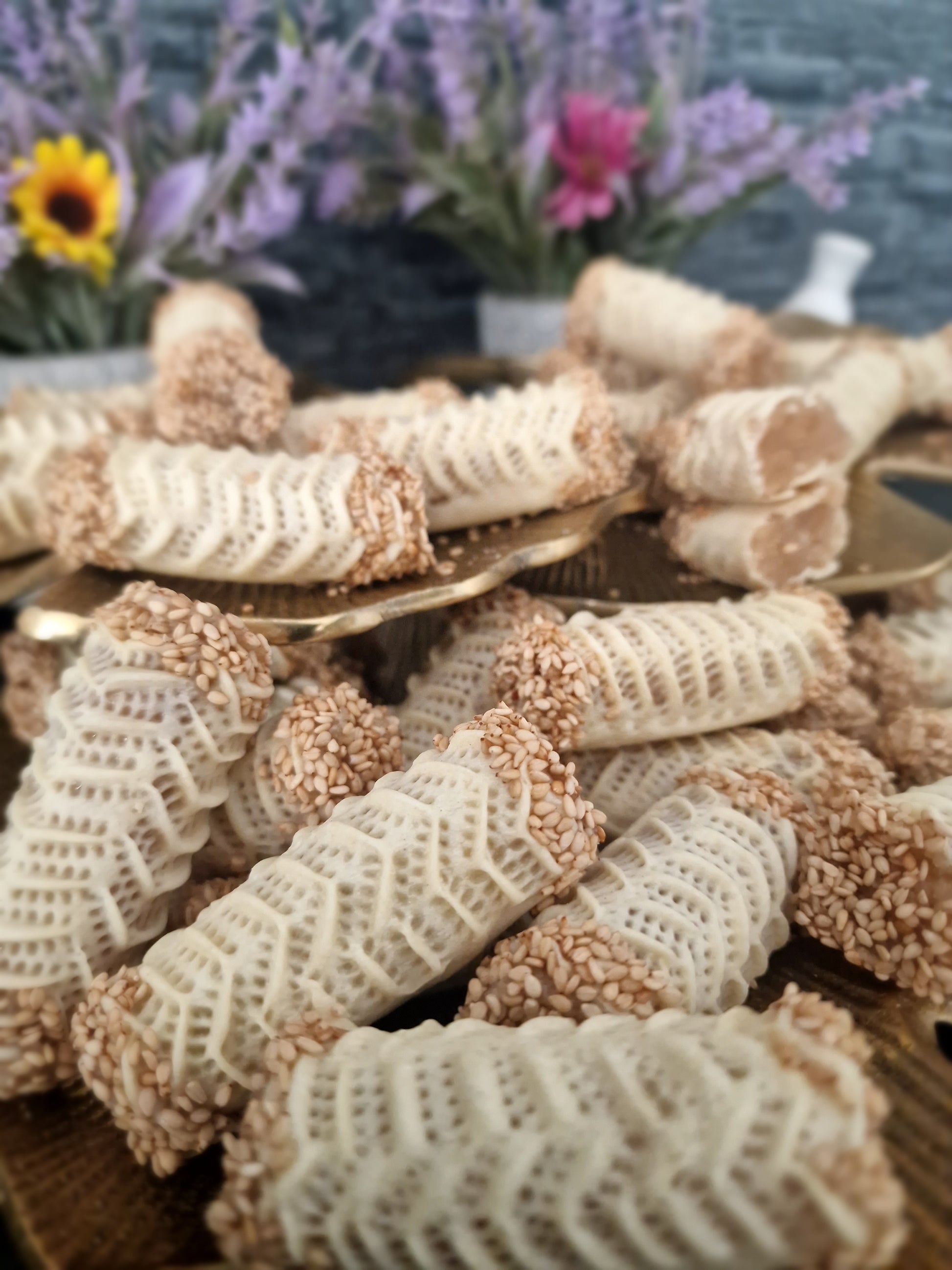 Onze ambachtelijke sesamkoekjes zijn een verfijnde lekkernij met een royale vulling van amandel, roomboter en een vleugje oranjebloesem.