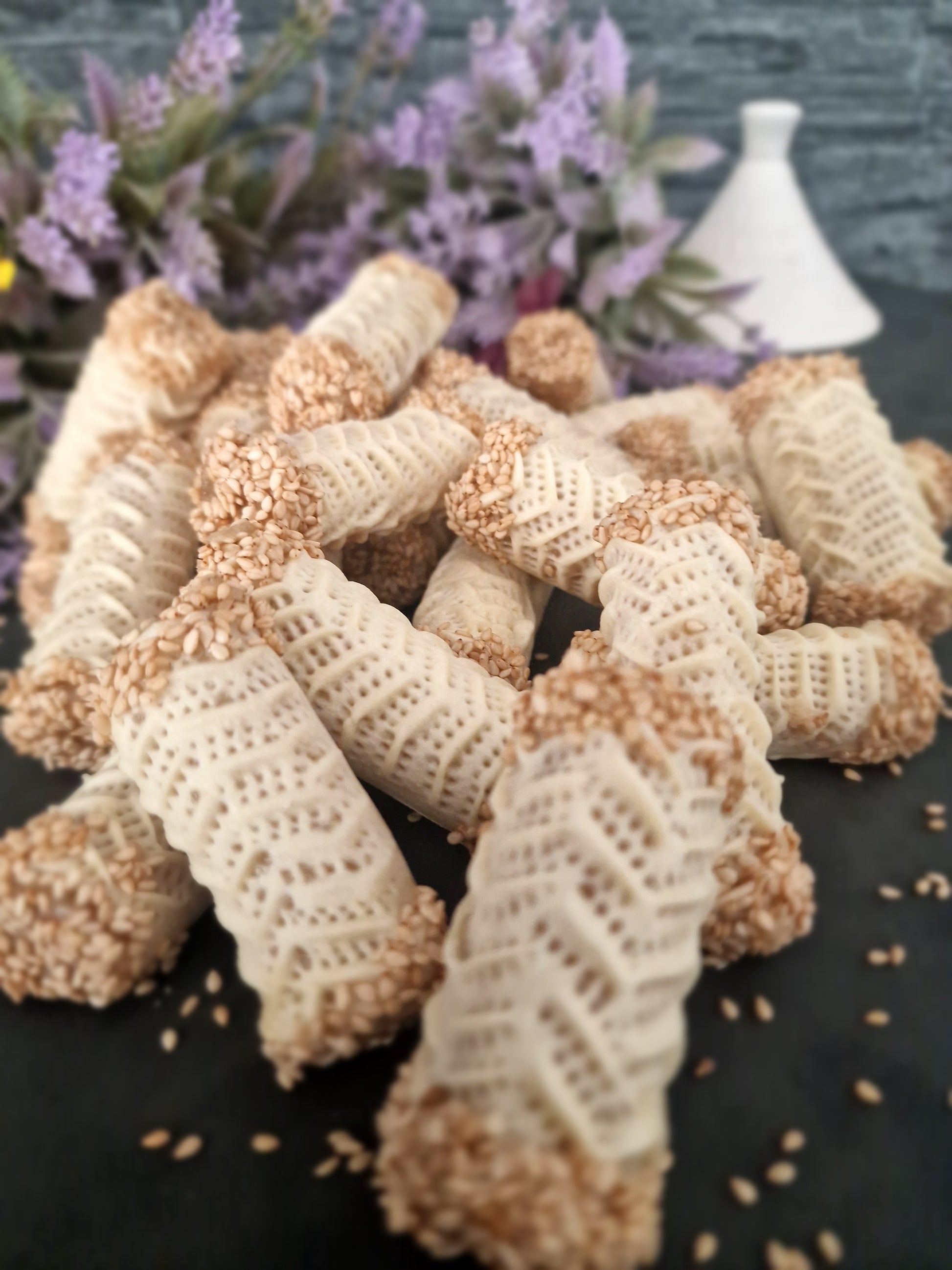 Het deeg is flinterdun en eveneens op smaak gebracht met oranjebloesem, waardoor de koekjes een heerlijke bloemige zachtheid krijgen.