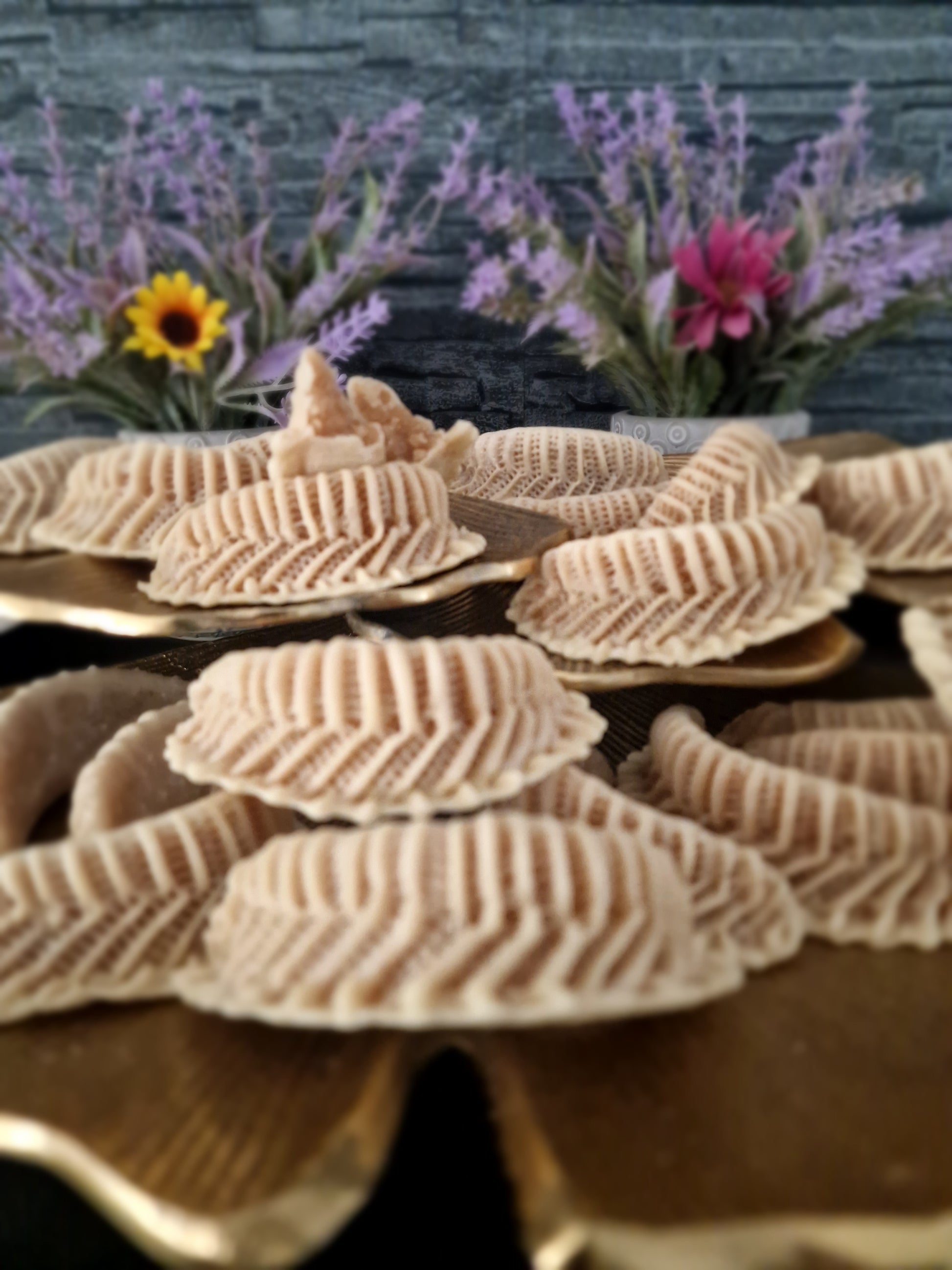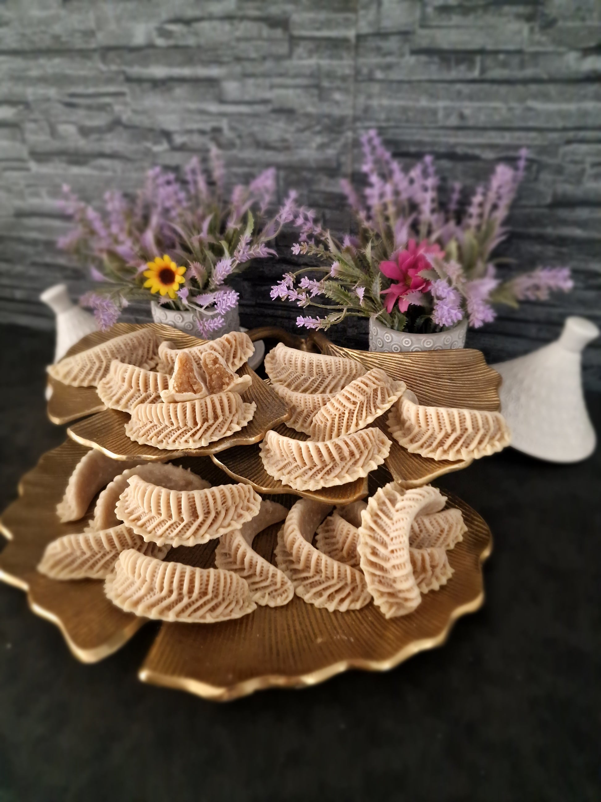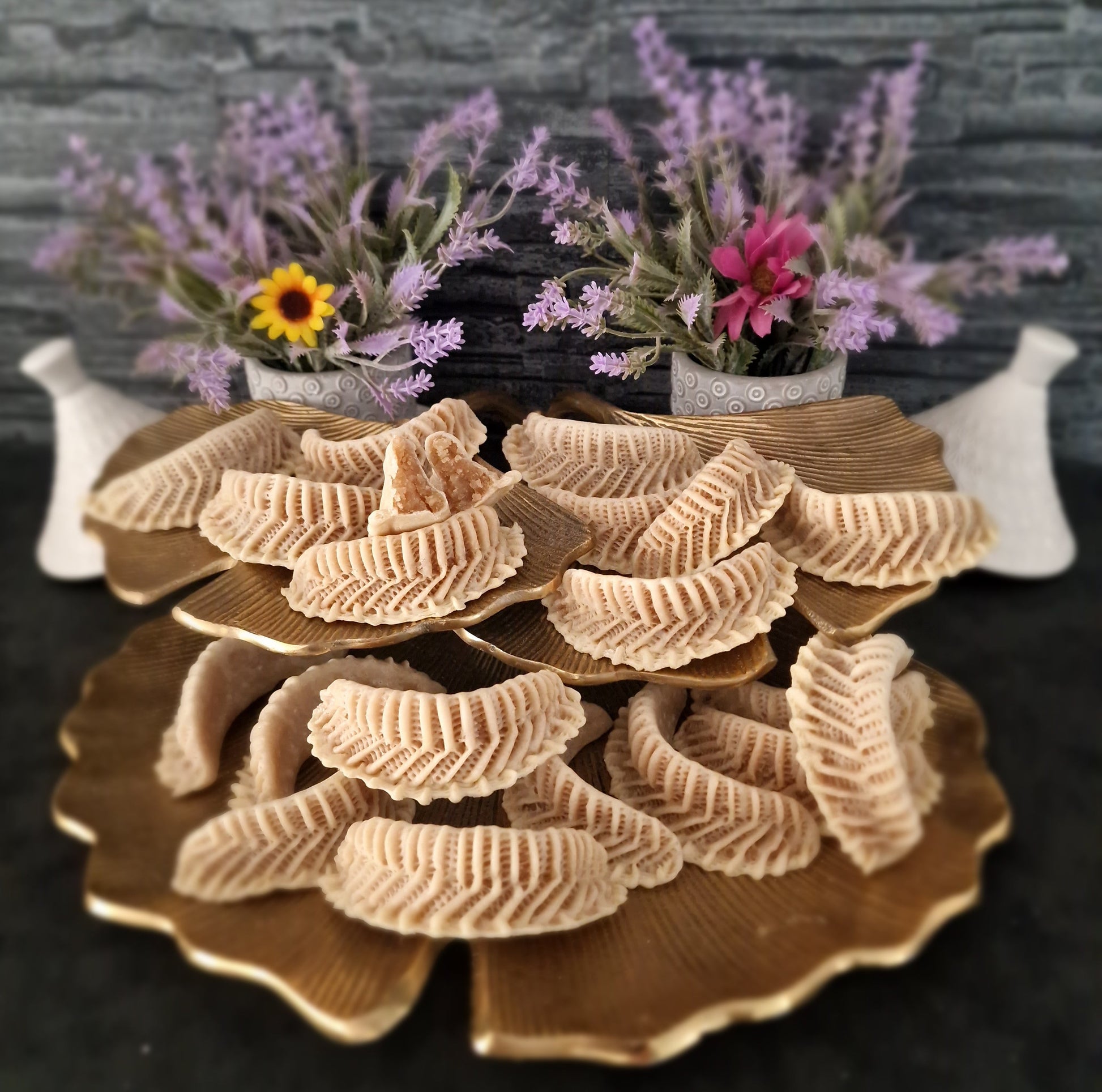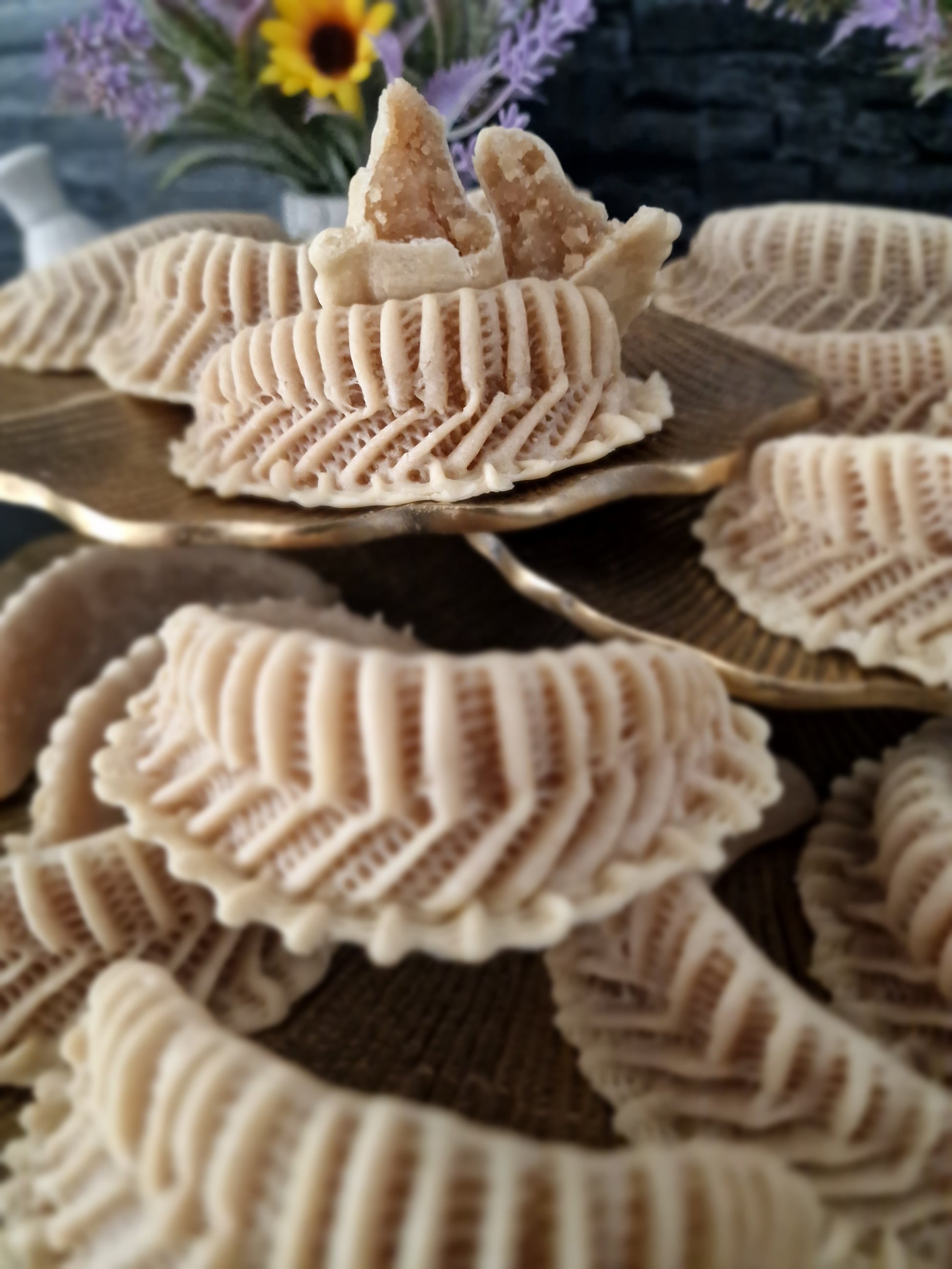 Laat je verleiden door deze prachtig vormgegeven Kaab Ghazal, een traditioneel ambachtelijk koekje dat niet alleen een lust voor het oog is, maar ook voor de smaakpapillen. Met de hand versierd in een verfijnd patroon, gevuld met een zachte huisgemaakte verse amandelpasta die verrijkt is met mazhar, oftewel een delicate aroma van oranjebloesemwater.