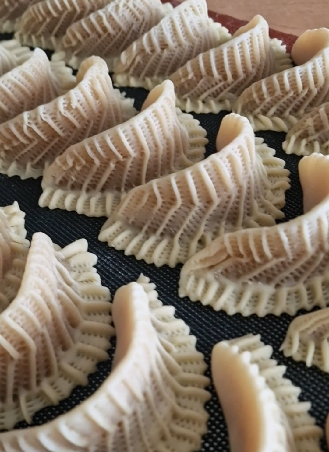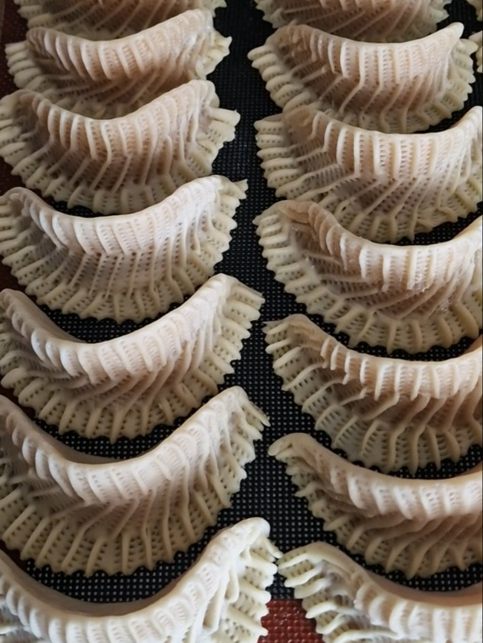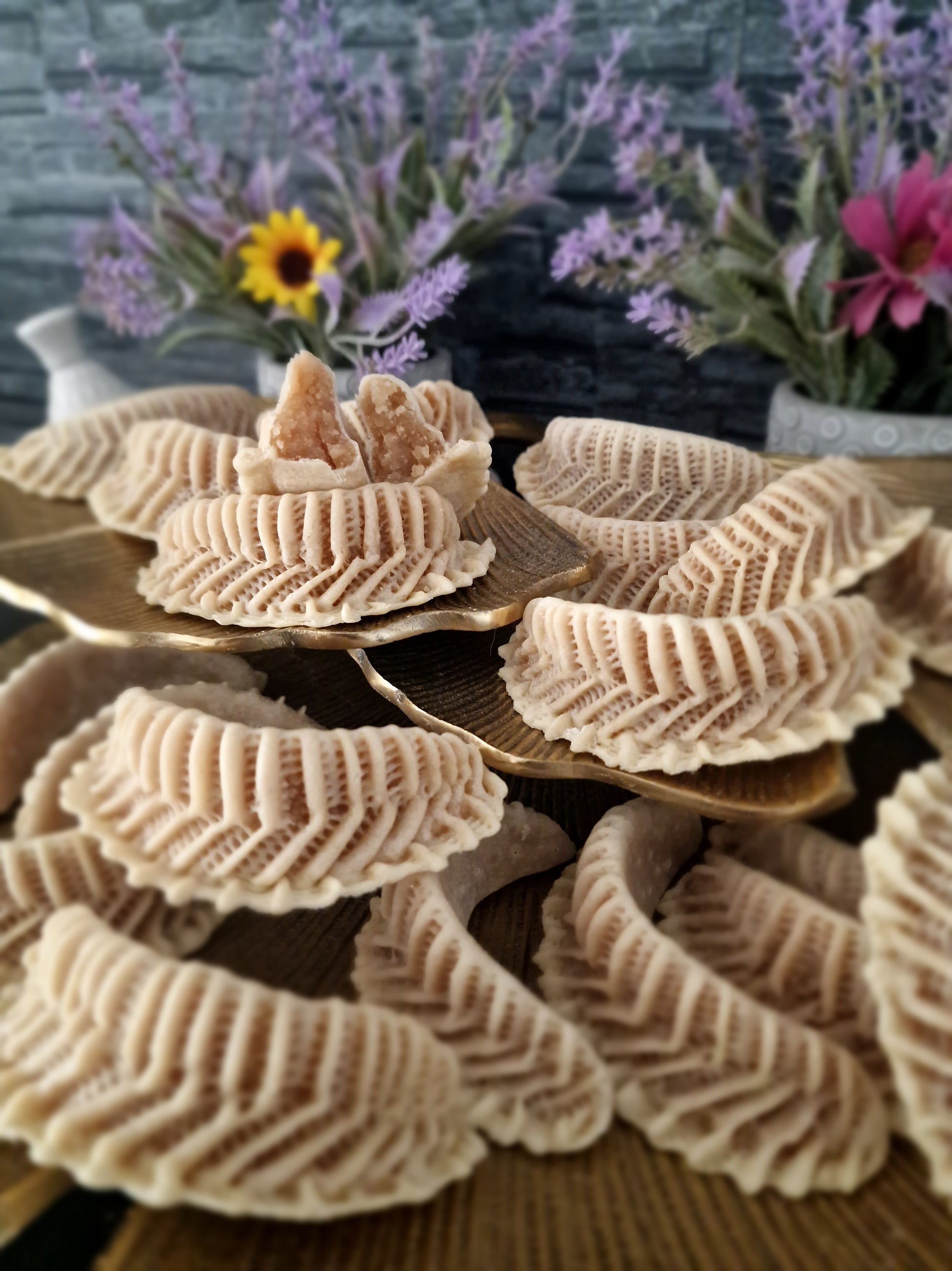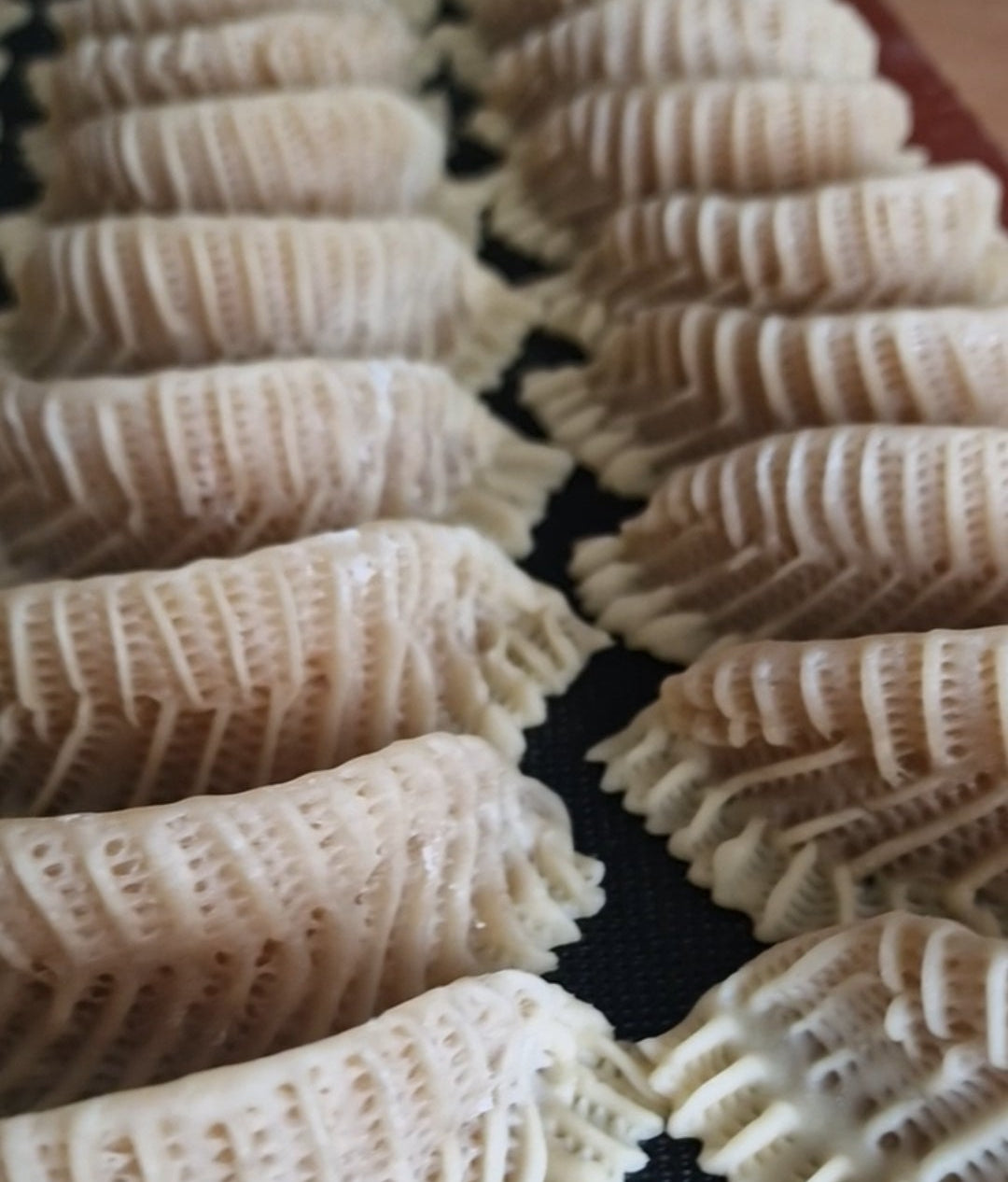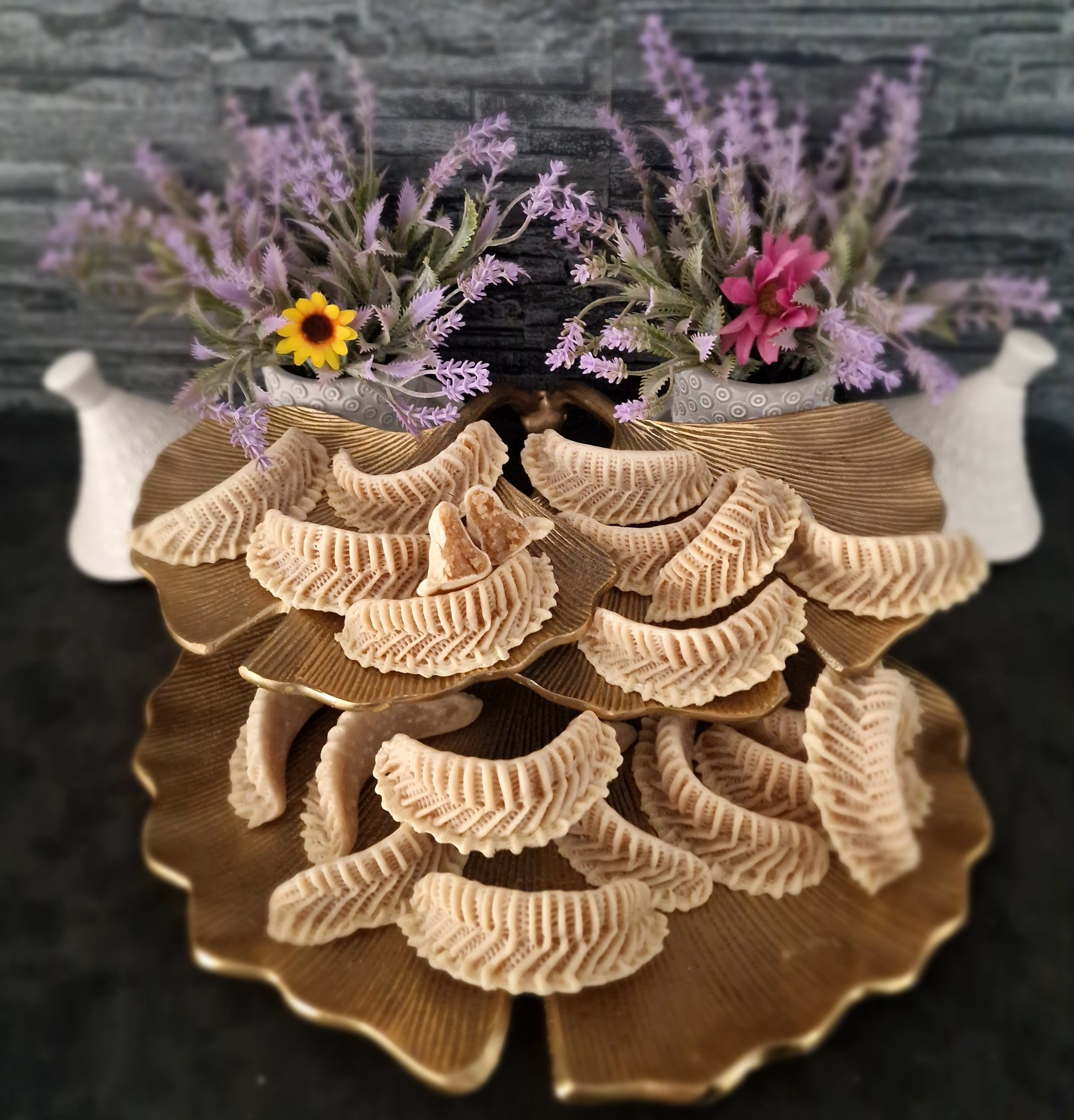 Laat je verleiden door deze prachtig vormgegeven Kaab Ghazal, een traditioneel ambachtelijk koekje dat niet alleen een lust voor het oog is, maar ook voor de smaakpapillen. Met de hand versierd in een verfijnd patroon, gevuld met een zachte huisgemaakte verse amandelpasta die verrijkt is met mazhar, oftewel een delicate aroma van oranjebloesemwater.