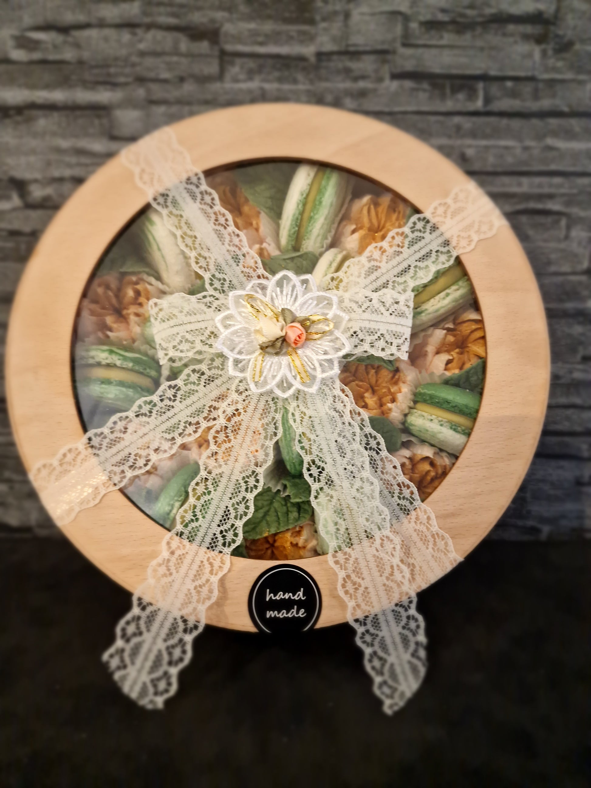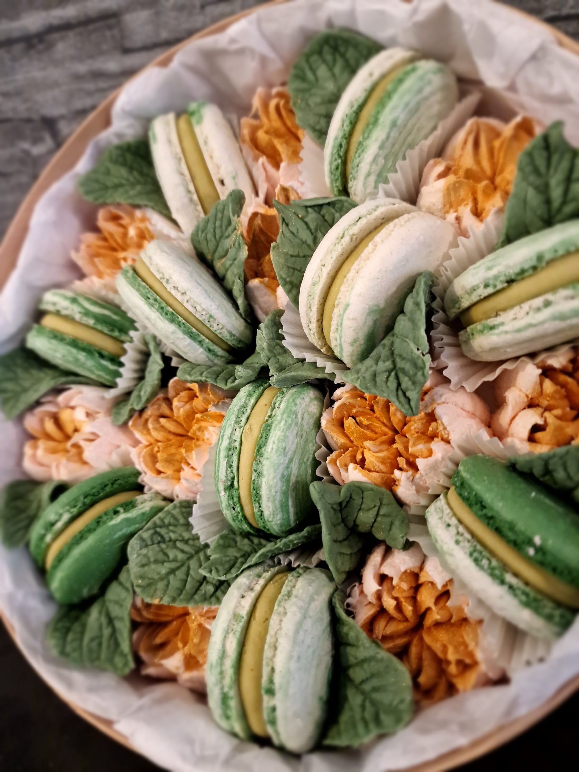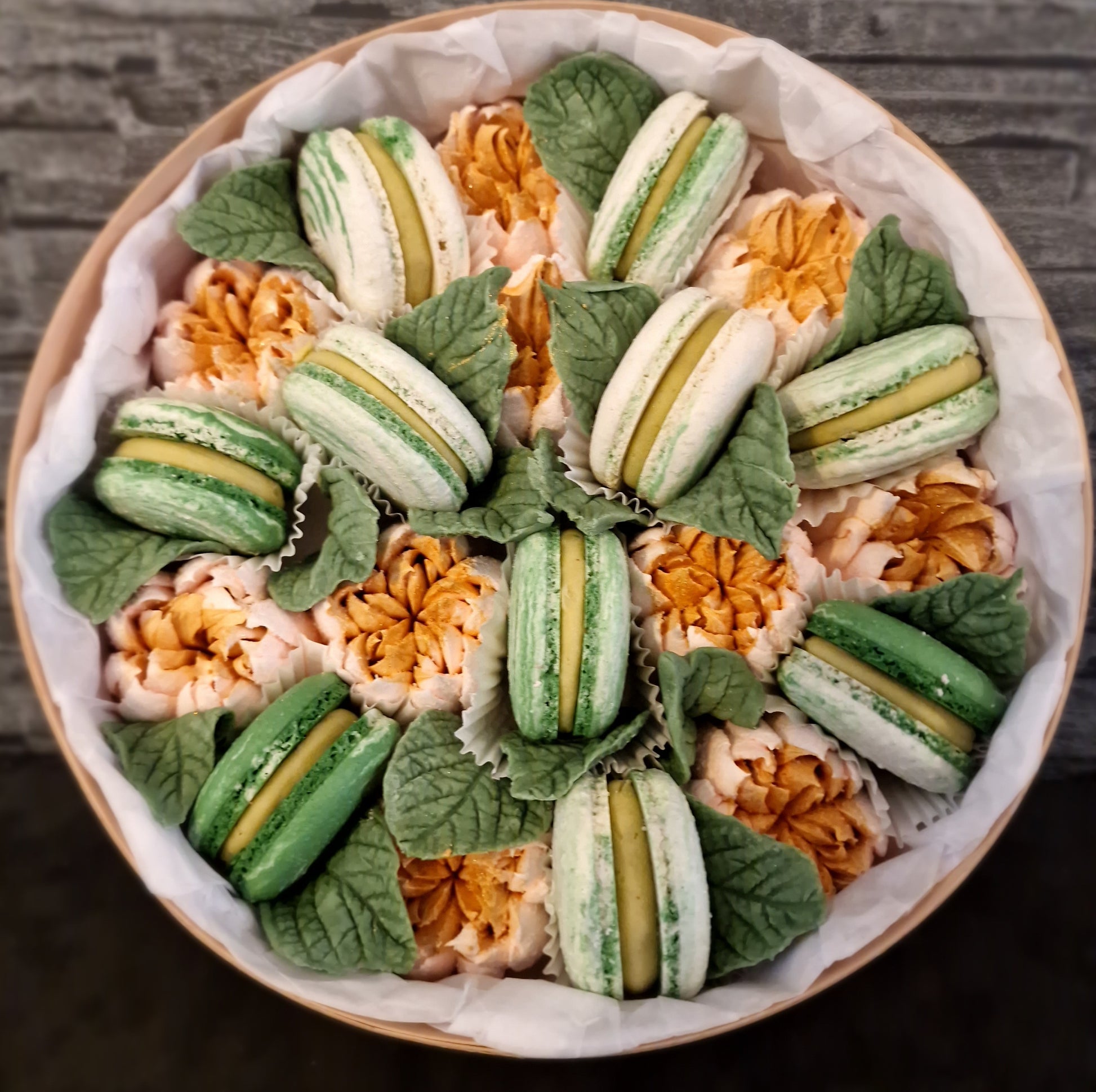 Onze prachtige macarons zijn een lust voor het oog en de smaakpapillen. Deze groene macarons zijn rijk gevuld met een romige pistacheganache die elke zoetekauw zal bekoren. Ze worden geleverd in een originele geschenkdoos die perfect is voor bijzondere gelegenheden.